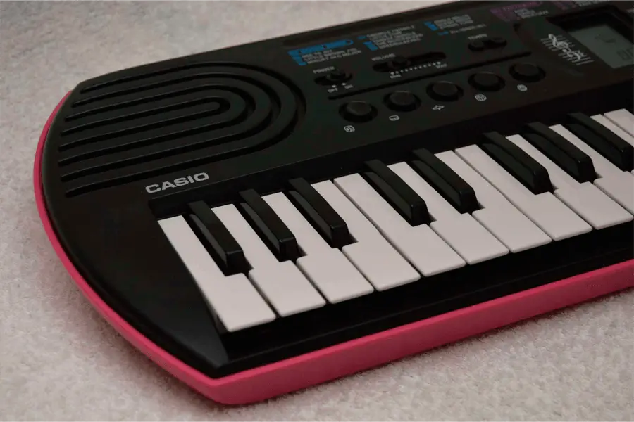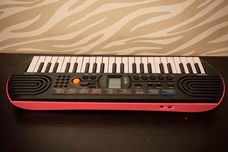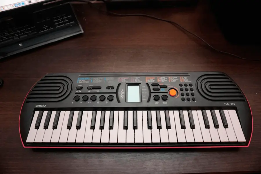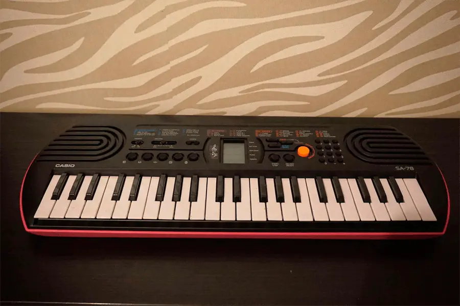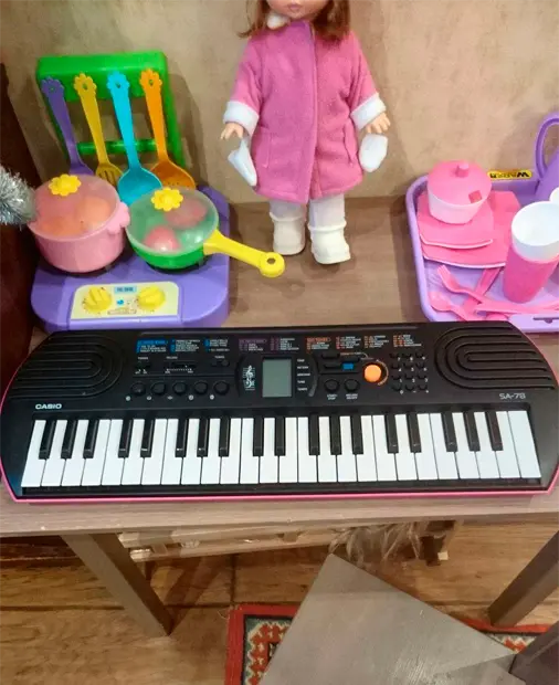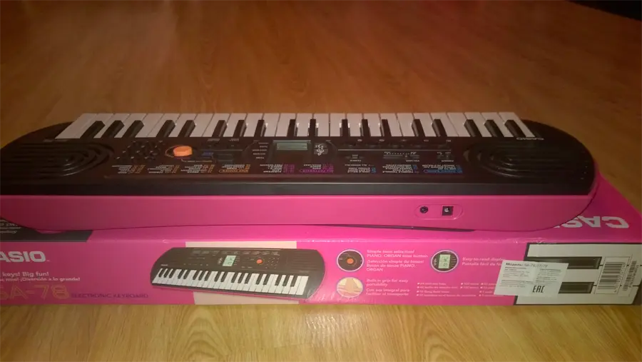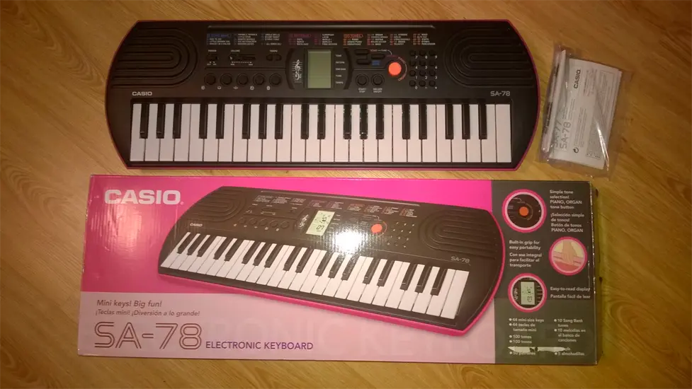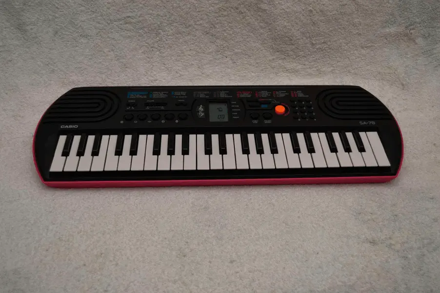 Синтезатор Casio SA-78 в стильном комбинированном корпусе черно-розового цвета предназначен для юных музыкантов, достигших трехлетнего возраста. Инструмент оснащен системой 8-нотной полифонии, звуковым процессором обновленного типа, 44 клавишами, монохромным дисплеем, динамиками и рядом функциональных кнопок. Синтезатор хранит в памяти 50 стилей, 100 тембров звучания и 10 ритмических композиций. С помощью крупной оранжевой кнопки можно выбрать звучание инструмента в стиле органа или фортепиано. Для хранения модели SA-78 достаточно компактного ящика письменного стола.