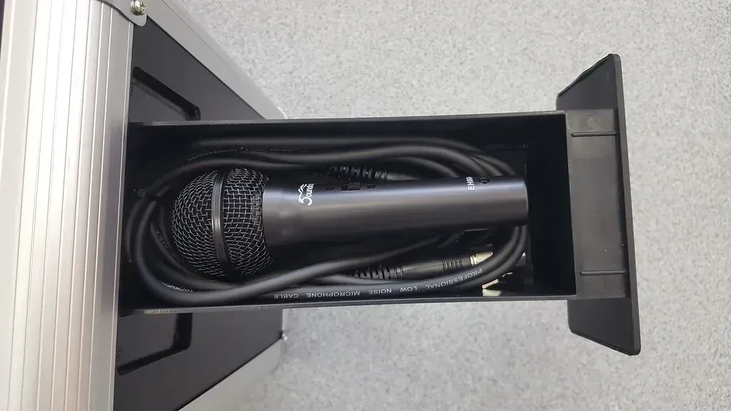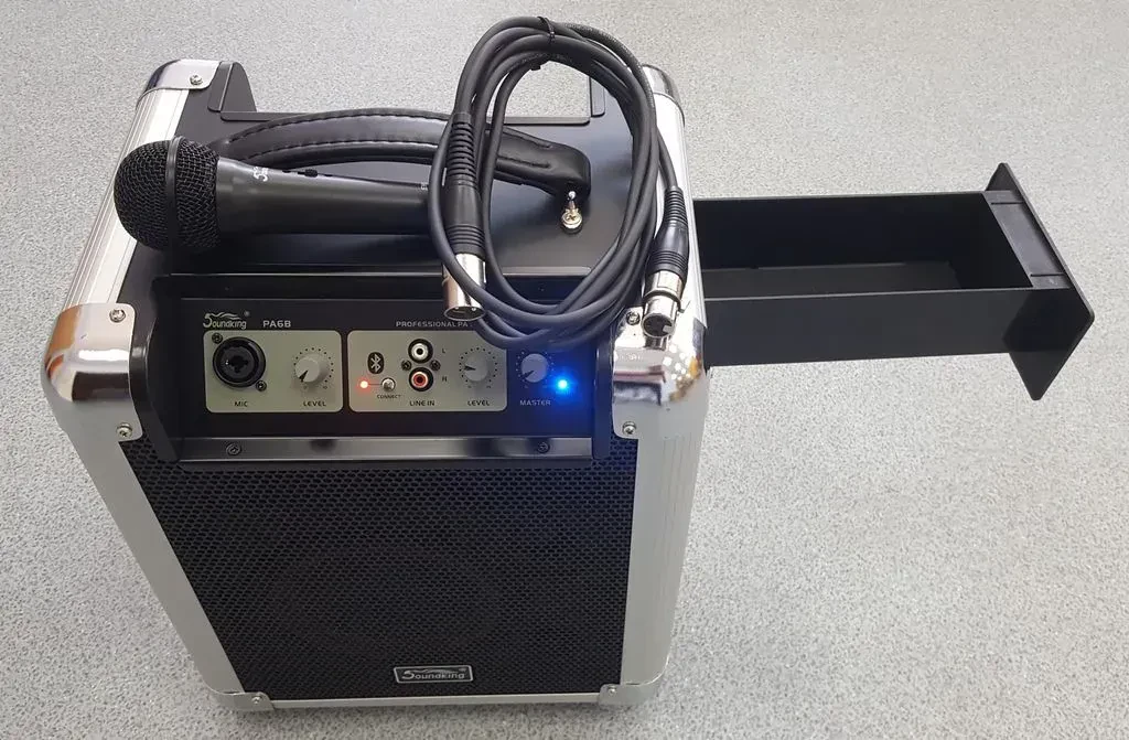 Портативная акустическая система с аккумулятором и ручкой для переноски. Емкости встроенного аккумулятора хватает на 4-6 часов автономной работы. Система отлично подойдет для конференц-залов, школ, вечеринок, работы на свежем воздухе.