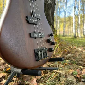 Великолепный бас в ореховом цвете. Качество изготовления очень достойное. Перед покупкой инструмент был тщательно настроен. Интонация практически идеальная. Струны отрегулированы на удобную высоту. Звучит потрясающе, справляется с любым жанром, но больше всего подходит для тяжелого рока. Настраивается и управляется легко. Электроника работает безупречно. Практически идеальный бас для своей цены.
