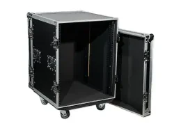 RMW-16U Кейс Рэковый 16U деревянный; ламинированная фанера 9мм; Глубина 500мм; две крышки; 8 замков-бабочек; 4 врезные ручки; 4 бесшумных колеса 3", 2 тормоза, рэковые направляющие с фронтальной и тыльной стороны.