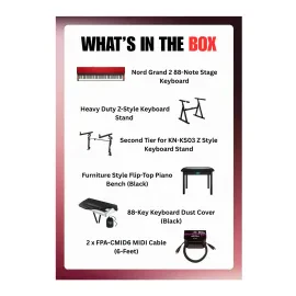 Отзывов пока нет. Если вы владеете информацией о товаре Nord Grand 2 88-Key Kawai Hammer Action Keyboard Bundle with Accessories, поделитесь ценным советом с теми, кто только собирается его приобрести.