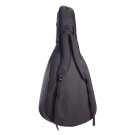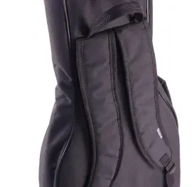 Внутренние швы чехла окантованы качественной тканой тесьмой. Два широких регулируемых по длине плечевых ремня сконструированы с учетом анатомических особенностей человека. Плечевые ремни выполнены из материала верха с мягкими прокладками внутри и дышащей эластичной сеткой снизу, надежно вшиты между деталями задней стенки. Лямки позволяют носить чехол как рюкзак. Боковая ручка из плотного материала верха с мягкой прокладкой внутри надежно вшита через усилительные прокладки, удобна для переноски гитары в горизонтальном положении. На задней стенке настрочено полукольцо, на которое удобно повесить чехол вертикально.